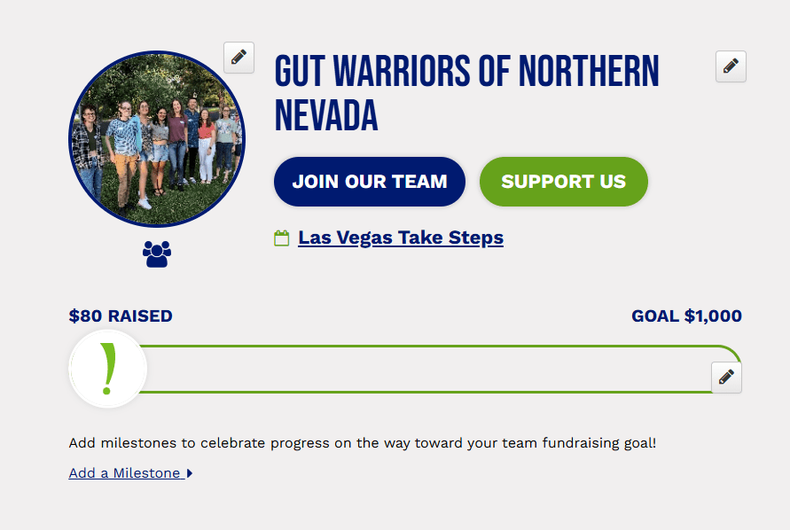 This year, members of my support group and I are participating in the Las Vegas Take Steps fundraiser to help find cures for IBD. Take Steps is an annual fundraiser walk organized by the Crohn’s and Colitis Foundation. This is our first time participating as a team from Northern Nevada and our team goal is to raise $1,000 by April 26th, with each of us committed to raising $250. Every dollar raised accelerates breakthroughs in IBD research, delivers trusted resources, and improves care for millions.